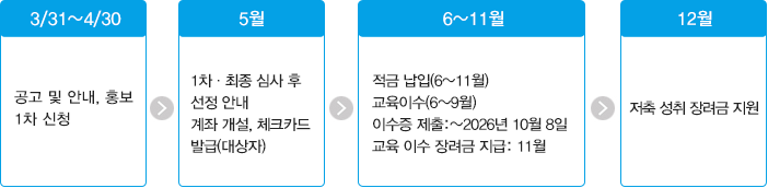 적금 납입 교육 이수 이수기간:~2026년 10월 15일) 이수증 제출:~2026년 10월 20일 이수 장려금 지급 11월 일괄 |